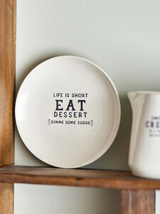 Wendy Plate från Creative Collection är en rolig desserttallrik tryckt med ett sött citat: "livet är kort ät dessert (ge lite socker)". Tårtfatet är tillverkat av stengods med vit glasyr och svart tryck. En mysig tallrik för servering av tårta och dessert.